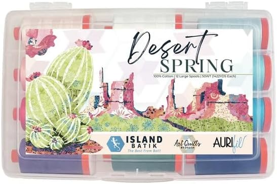 Desert Spring blends bold, large-scale designs with intricate raw- edge appliqué, all brought to life with the cheerful and vibrant prints from Just Dandy by Kate Colleran. To complement the project, Sondrasa has curated a stunning thread set featuring 12 large spools of Aurifil’s 100% cotton 50wt thread, her go-to choice for appliqué work.