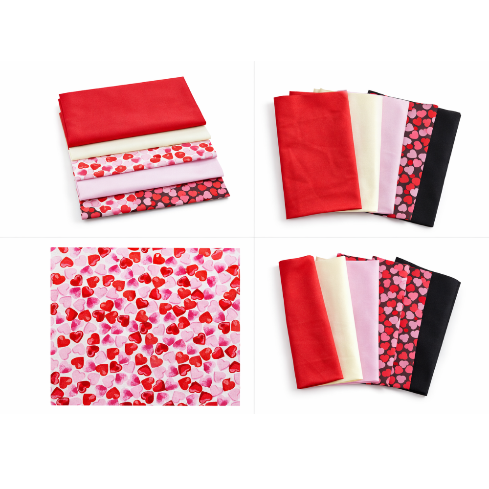 Add a romantic touch to your sewing projects with our Valentine Love Hearts Fat Quarter Bundle. This beautifully coordinated 6-pack includes a mix of charming heart prints and complementary plain fabrics in red, pink, ivory and black tones. Each fat quarter measures approximately 18 x 20 inches (45cm x 50cm), making them ideal for quilting, patchwork, bunting, gift bags, cushion covers and Valentine’s Day crafts. Made from 100% cotton poplin, the fabric is soft, breathable and easy to cut and sew — perfect for both beginners and experienced makers. Whether you're creating heartfelt handmade gifts or seasonal décor, this bundle offers colour harmony, versatility and excellent value in one convenient pre-cut pack.